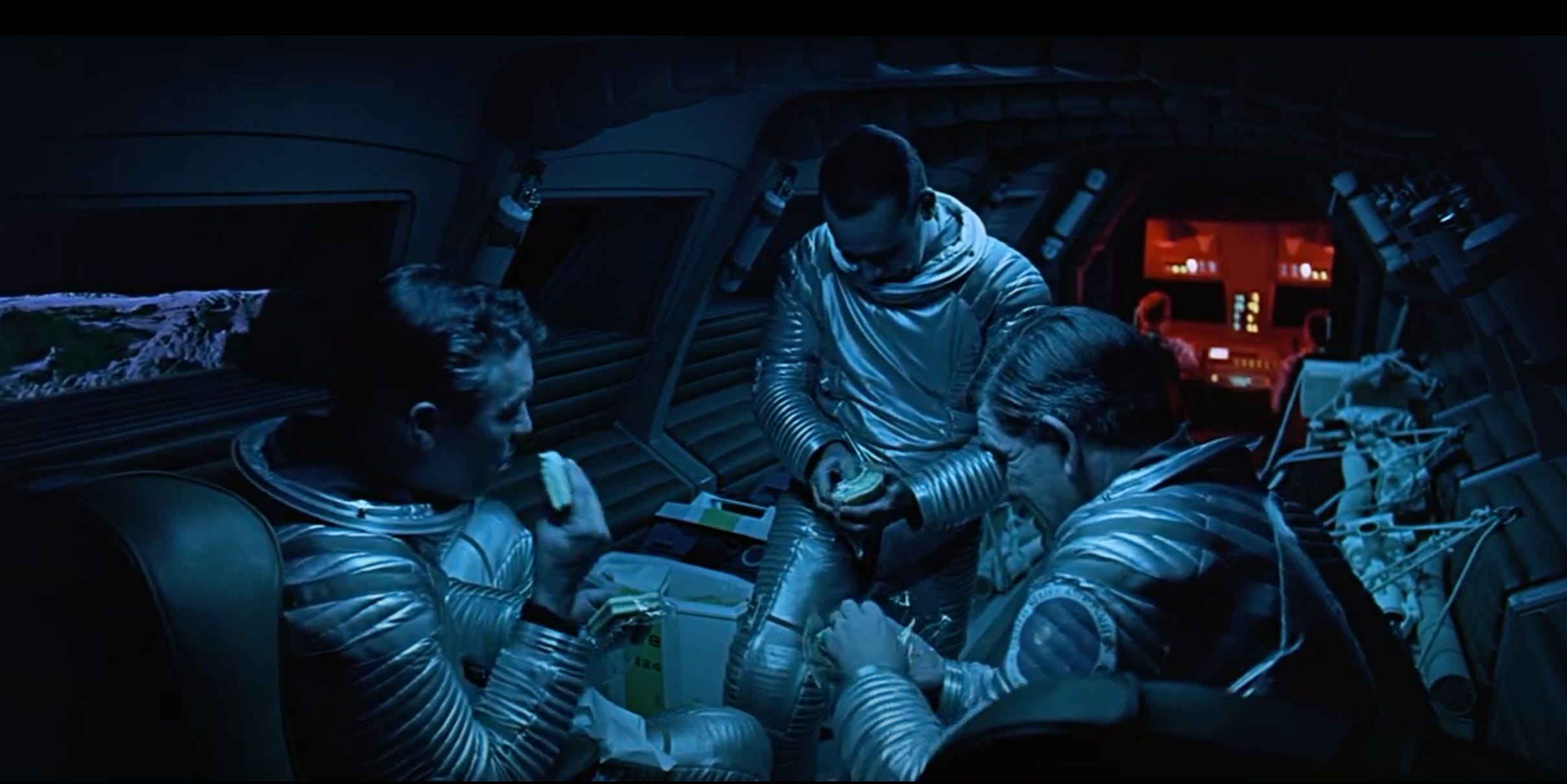 2001 takes place in space, which has technical limitations. Food eaten in spacecraft has to be something that won't float away, cause a mess, or, worse, spill somewhere dangerous. Early astronauts mostly squeezed dehydrated food out of tubes. Today's astronauts have a few more options but still have to make compromises like substituting tortillas for bread to cut down on escaping crumbs. They've even managed to grow crops of tomatoes and kale on the International Space Station, a painstaking process which involved pollinating pak choi with a small paintbrush. Totally worth it, though, as the effects of micro-gravity upon the body mean astronauts need to consume more calories than the rest of us down on Earth.